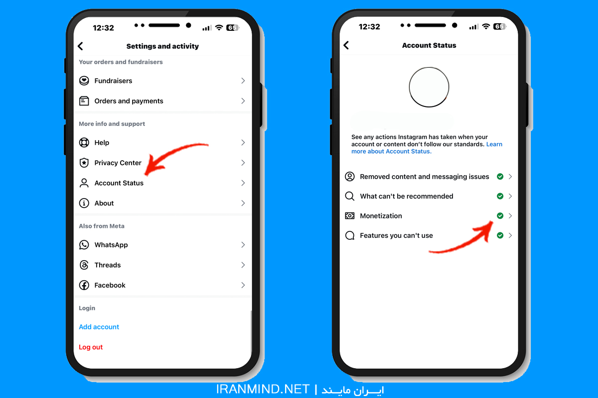 - مجدداً صفحه را به پائین اسکرول کنید. روی گزینه account status بزنید.