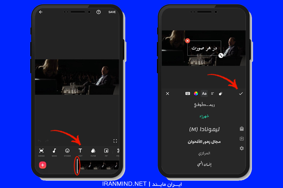 برای همین بعد از وارد کردنِ متن، می بینید که چهار آپشن در نوارِ تکست فعال می شود. از جمله رنگ، فونت، چینش و ترنزیشن های ورود و خروجِ متن. روی گزینه Aa (فونت) که بزنید، می توانید از قسمتِ فروشگاهش با انتخابِ زبانِ عربی، فونت های جذابِ بیشتری به صورتِ رایگان دانلود کنید.