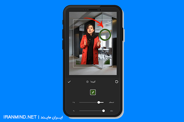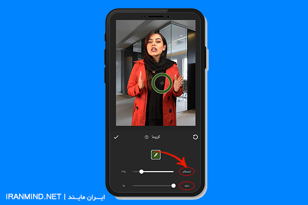 5. با کلیک روی گزینه ی کروما و قراردادن غلطانک روی پس زمینه، به راحتی پس زمینه ی ویدیو حذف می شود. می توانید از قسمت استحکام، لبه های سبز باقی مانده روی سوژه را حذف کنید.