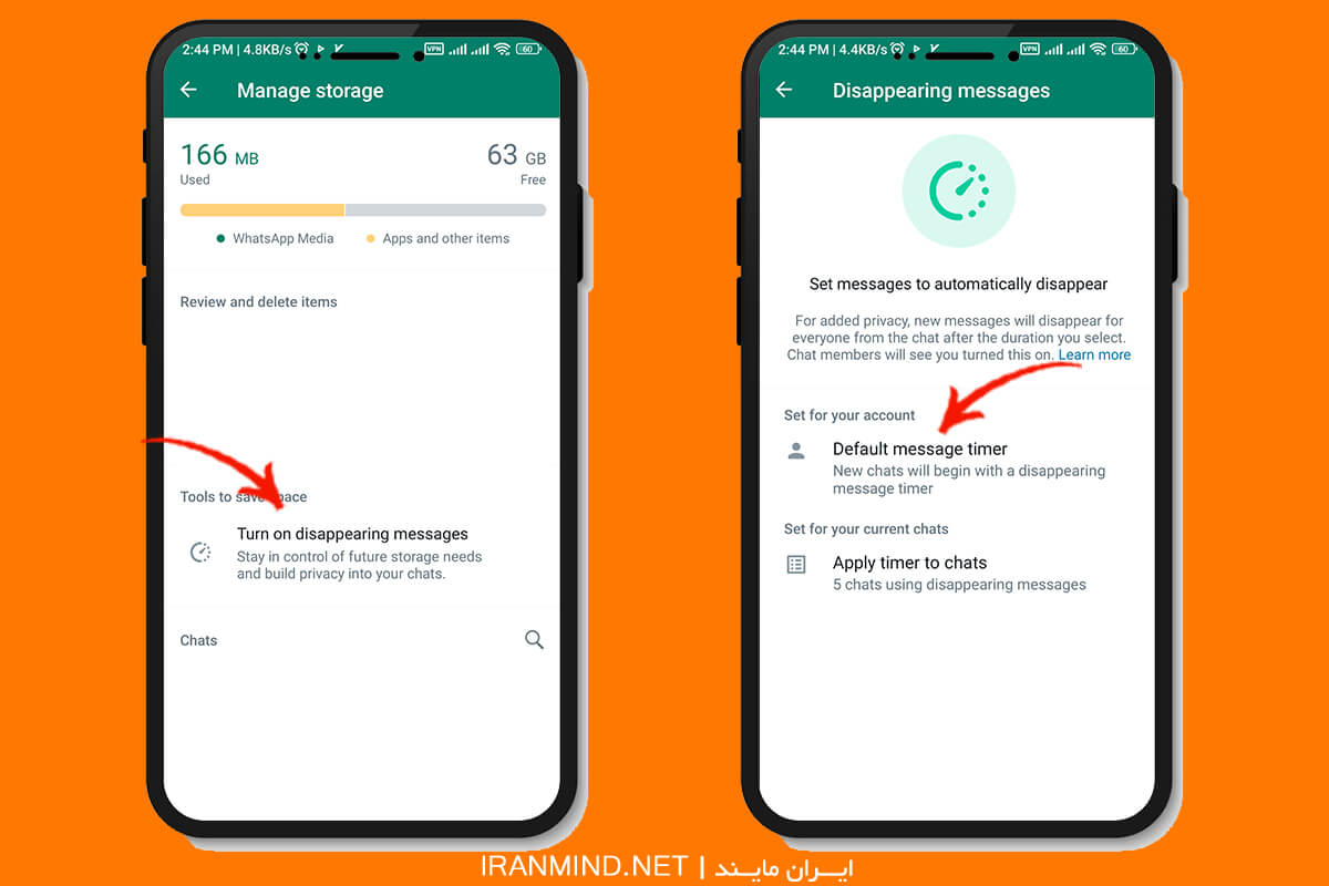 برای این کار روی سه نقطه معروفِ بالای صفحه بزنید، به قسمت stotage & data بروید، manage storage را انتخاب کنید، حالا از گزینه turn on disappearing messages و بعد default message timer، زمانِ دلخواهتان را وارد کنید.