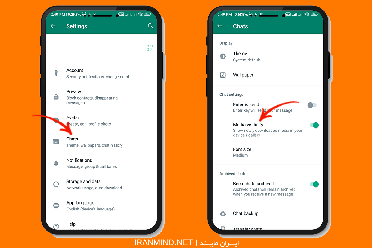 برای جلو گیری از این کار: روی سه نقطه بزنید، وارد ستینگ شوید، روی گزینه چت بزنید، حالا با فعال کردنِ آپشنِ media visibility از ذخیره شدنِ خودکارِ فیلم ها و عکس ها در گالریتان جلو گیری کنید. به همین راحتی.